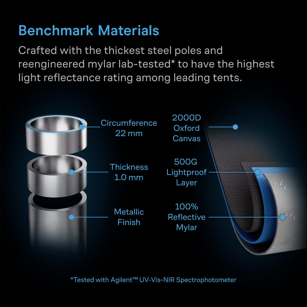 Constructed from ultra-durable 2000D oxford canvas and reinforced with 1-inch steel poles, the Cloudlab 816 tent exceeds standard grow tent durability. It features multiple hanging bars, a heavy-duty floor tray, reinforced corners, and front zipper flaps with a 500G light-proof layer to prevent light leaks.