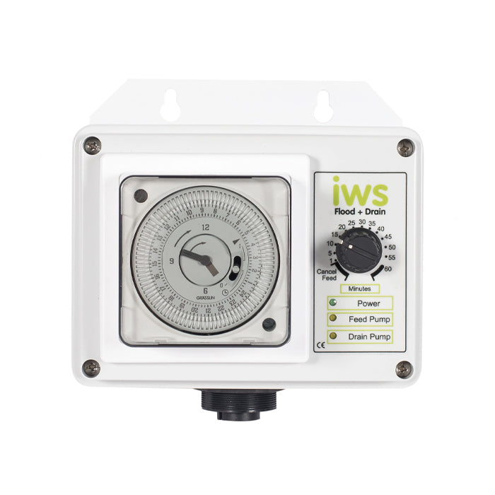 The IWS Remote Timer / Brain & Timer is the control “brain” that handles the timing for your IWS Flood & Drain hydroponic system. This unit includes a remote minute timer that lets you set feeding durations between 1 and 60 minutes, along with override and cancel functions for flexible control.