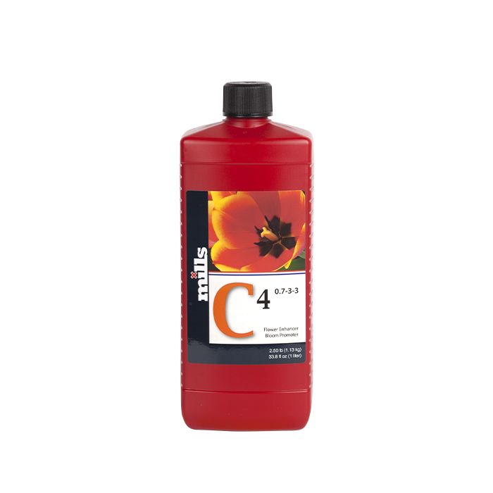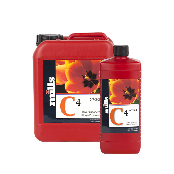 Mills Nutrients C4 is a bio-stimulant supplement that’s used during mid to late bloom to help encourage plants to produce, not only healthy fruits and flowers, but to also to push their size, density and final weight, giving the grower yields they never thought we’re possible.